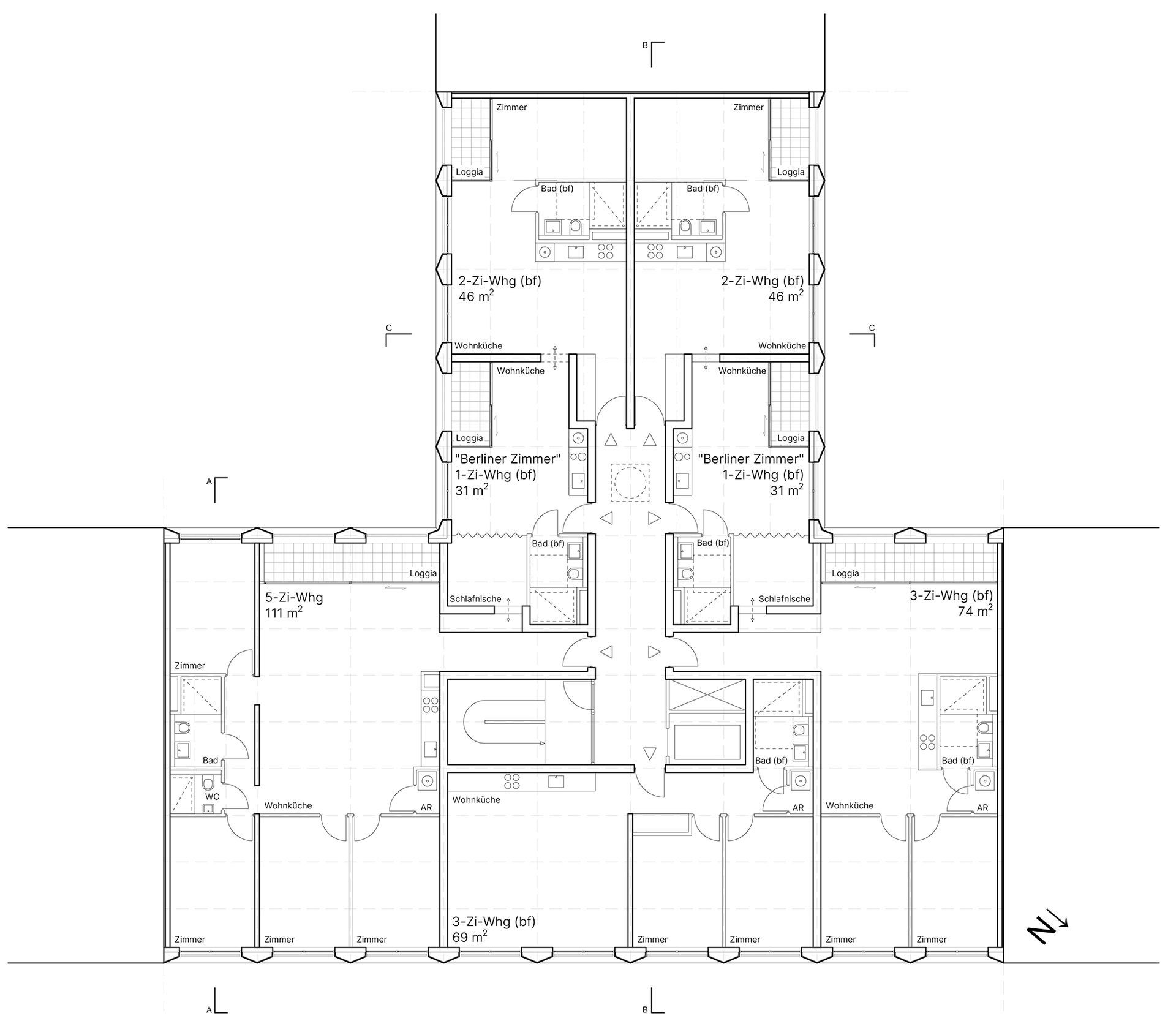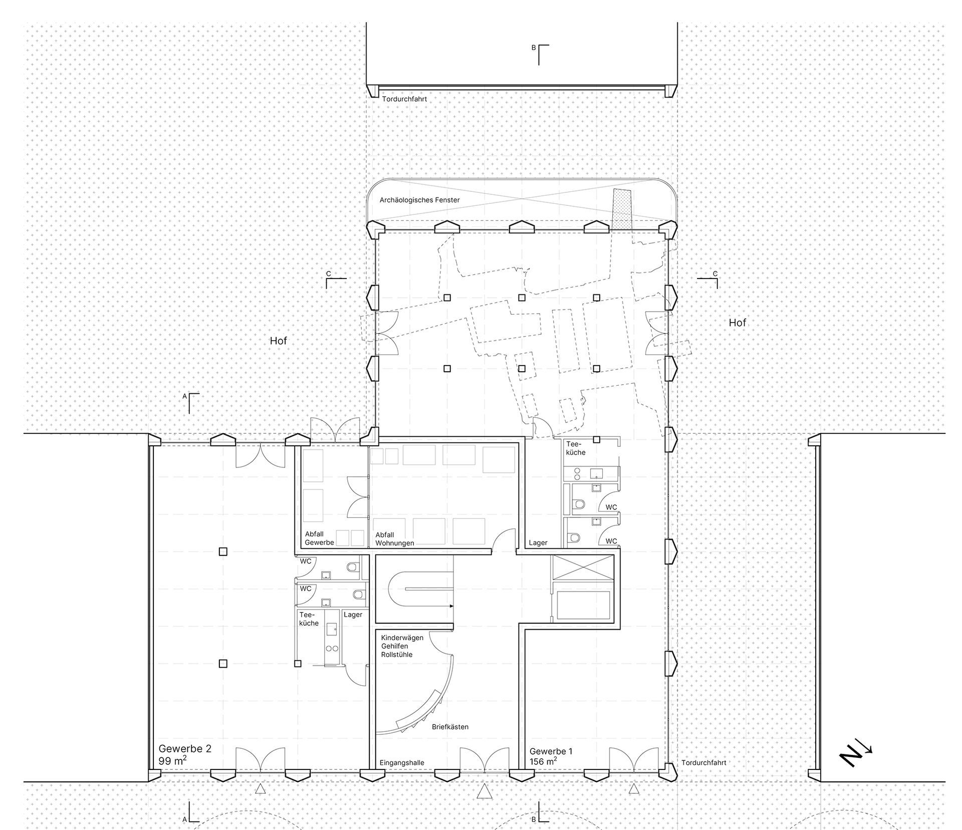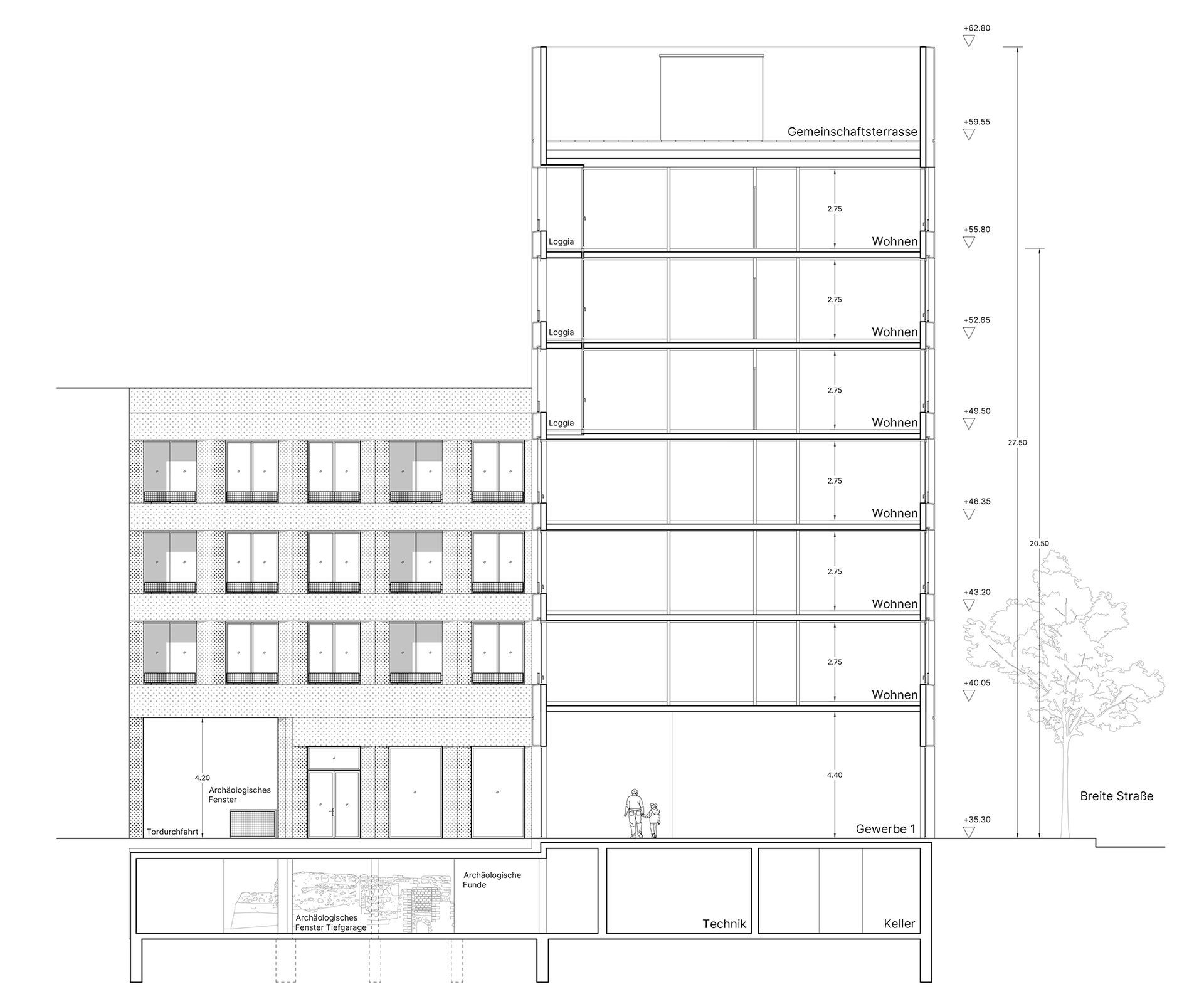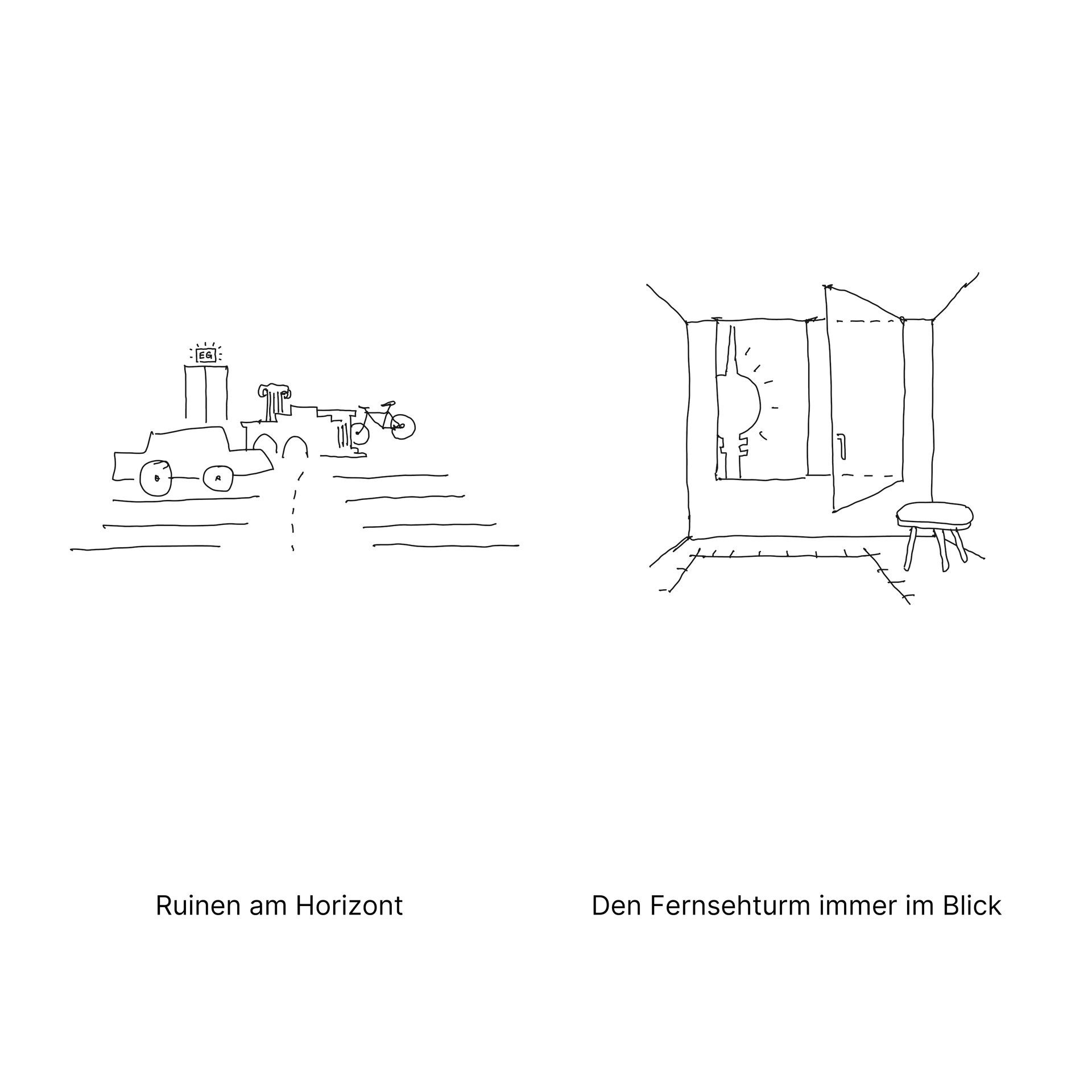 24 apartments, 6 “Berliner Zimmer”, 2 flexible ground floor spaces, integration of archeological findings and a communal roof terrace “Der Himmel über Berlin”.