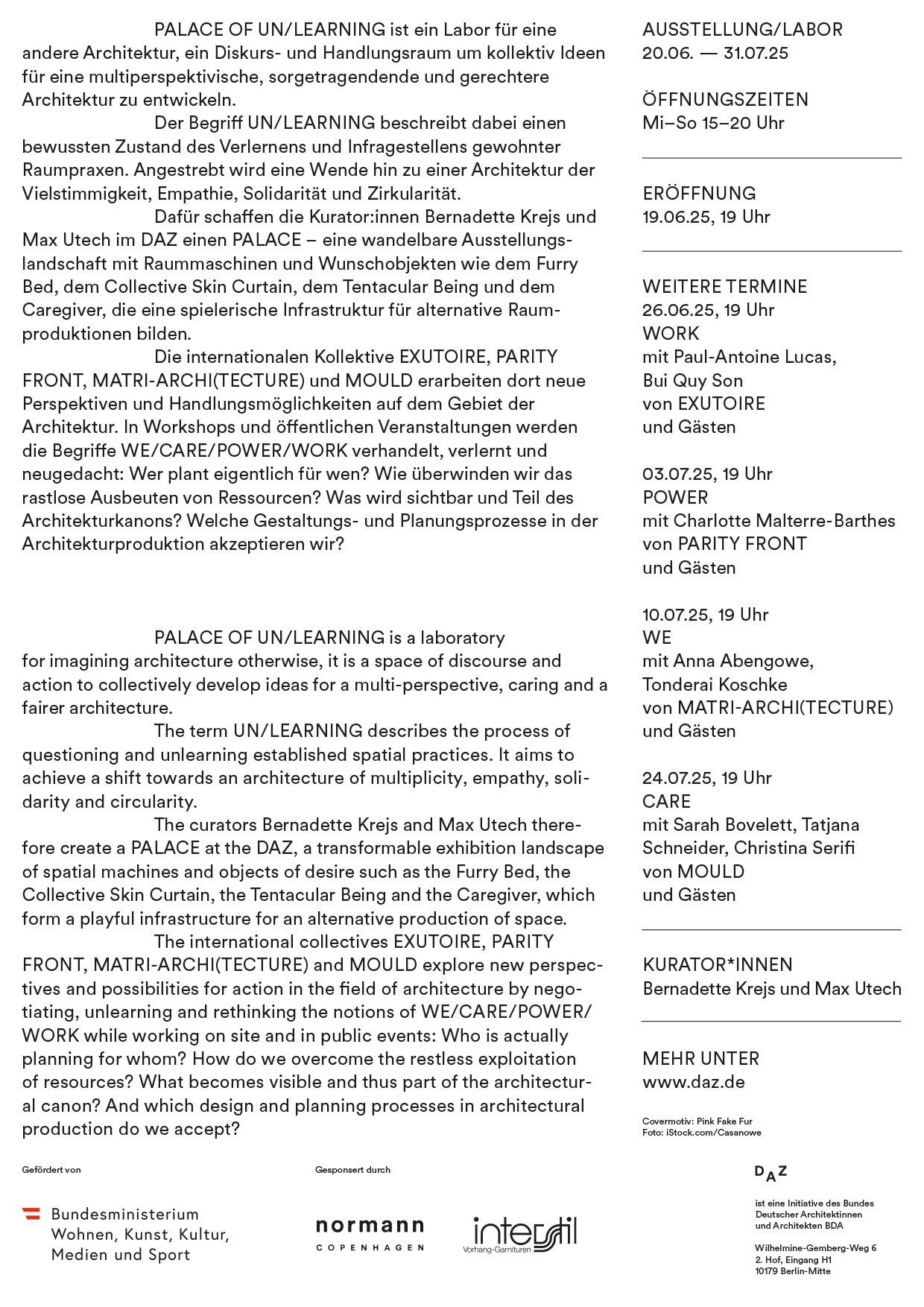 We are at a turning point. Society and climate are in a deep crisis and it is time to think architecture otherwise in order to find multi-perspective approaches and possibilities. PALACE OF UN/LEARNING is a laboratory for imagining architecture otherwise, a space for discourse and action in which ideas for a more caring and fairer architecture are collectively researched, developed and negotiated.