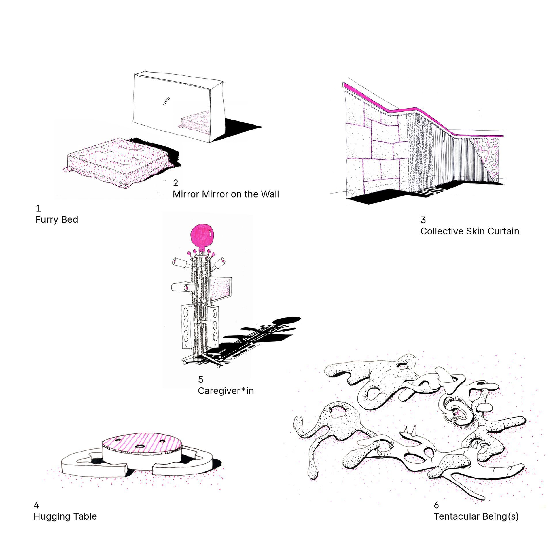 - a transformative, joyful and open laboratory of space machines and objects of desire such as Furry Bed, Collective Skin Curtain, Hugging Table, Tentacular Being and Caregiver, which will create an infrastructure for a collective, tentacular knowledge production.