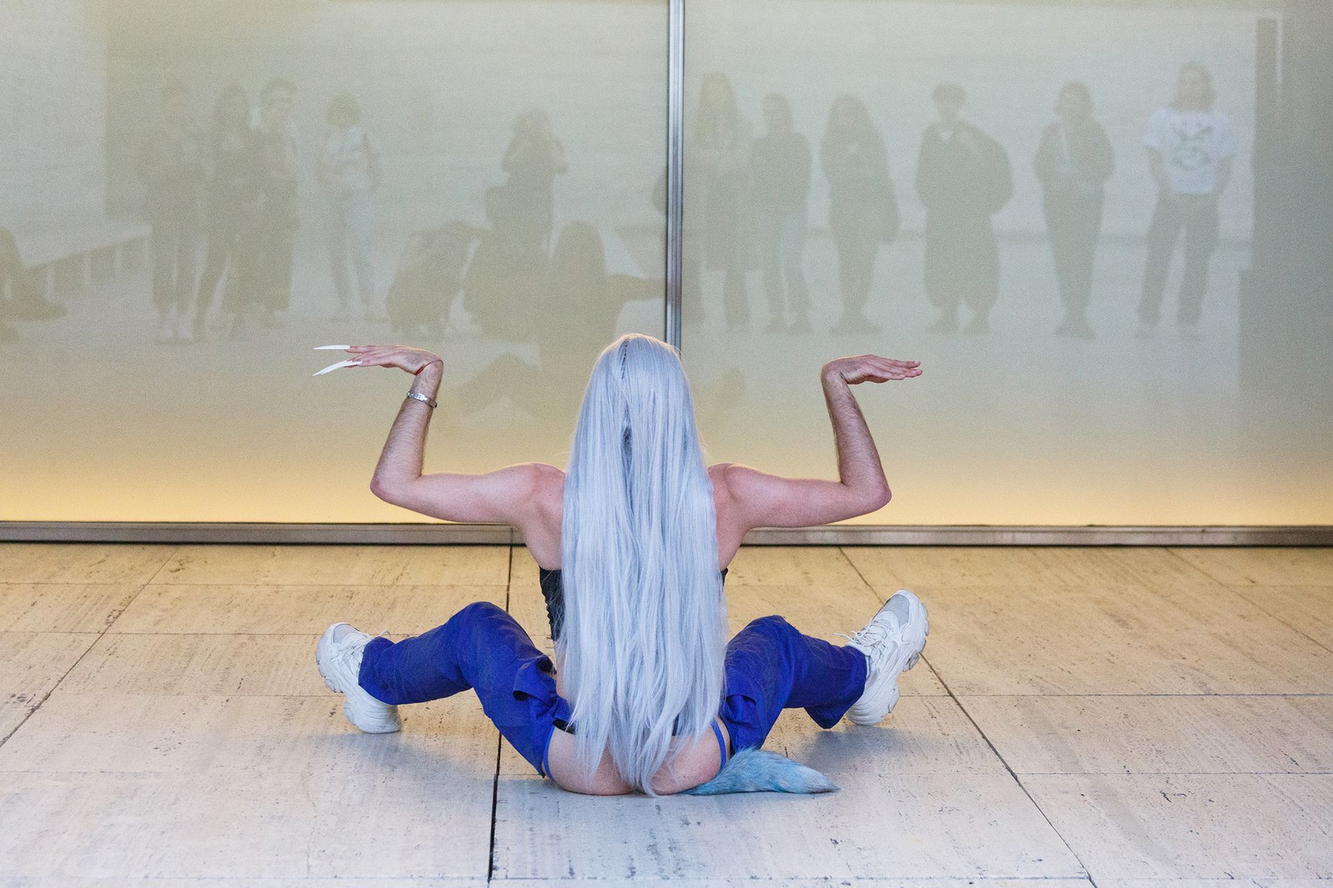The invited two Performers Jayce (Voguing/Ballroom culture) and Iver Zapata (Queer/feminist view on contemporary dance) supported the participatory action by interacting with the installations and used the glitch in the institutional setting to claim their space and powerfully present their dissident performative spatial practice.