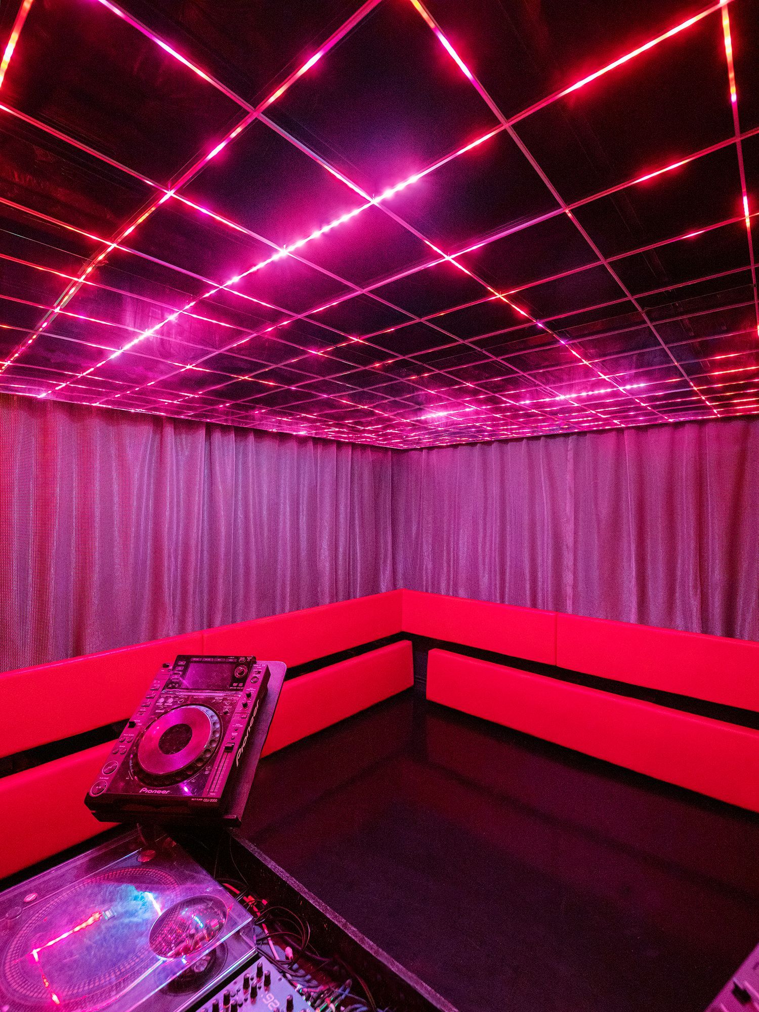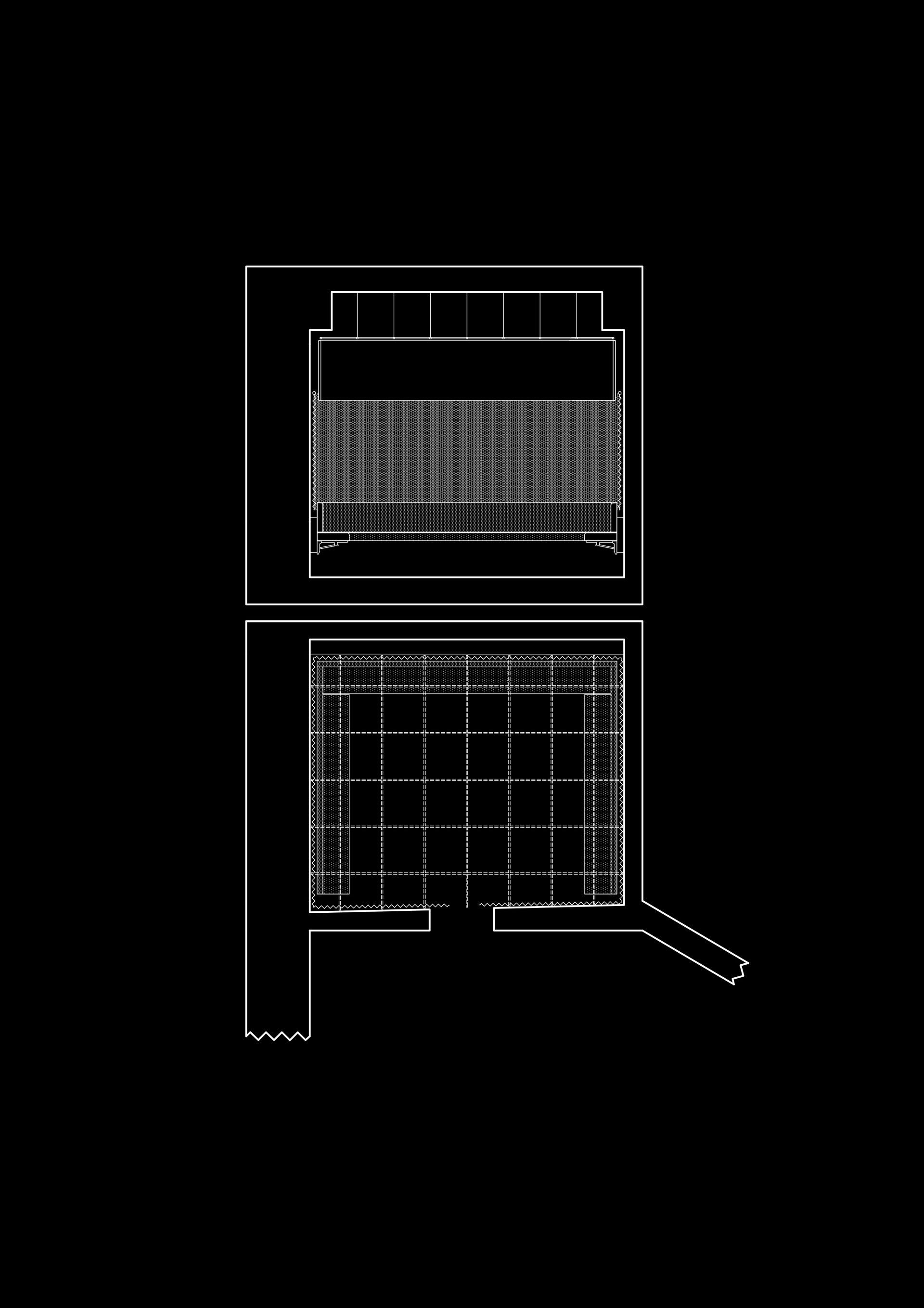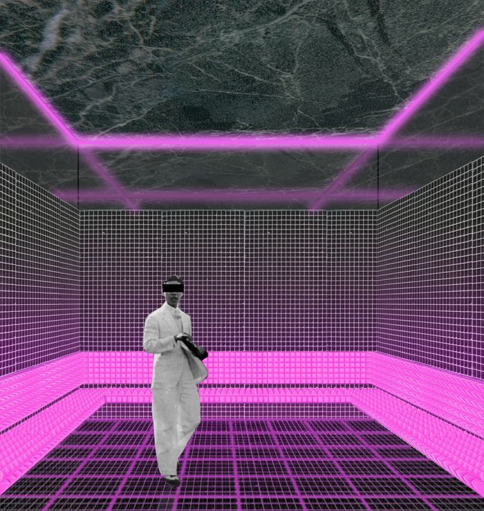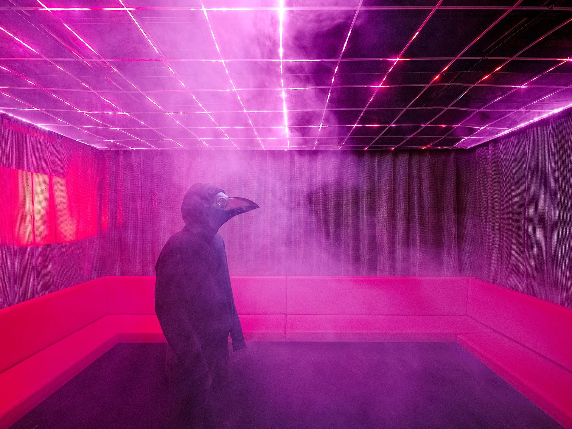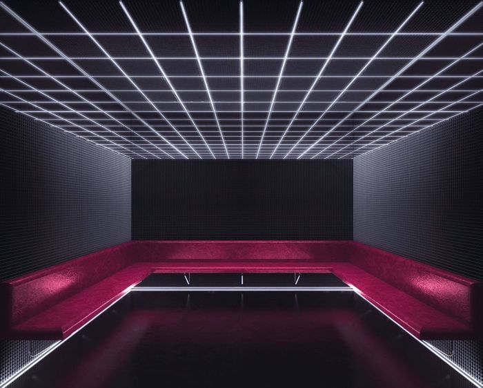 A new séparée for hedonistic uses of all kind at an existing cocktail bar - an ambiguous space that is contrasting an infinite ceiling with the cozy narrowness of the soft metal cage below while the campy fake ostrich leather benches echoing its former brothel use.